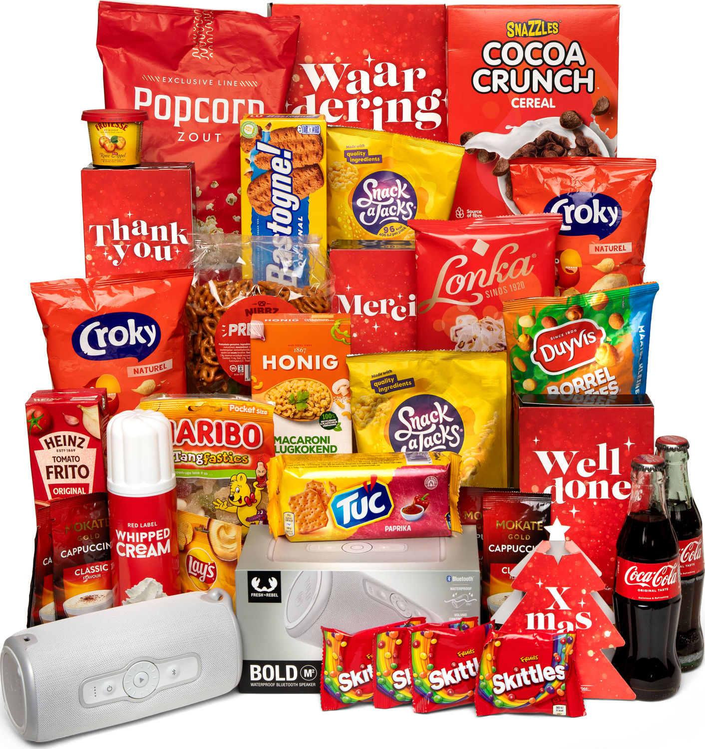 Deze feestelijke food box is de perfecte traktatie voor elke gelegenheid. Boordevol een assortiment van heerlijke snacks en lekkernijen, biedt deze box een ware smaakervaring voor iedereen. De kleurrijke verpakking en uitnodigende presentatie maken het een ideaal cadeau of een speciale verwennerij voor jezelf. Of je nu op zoek bent naar een zoete traktatie of een hartige snack, deze zorgvuldig samengestelde selectie heeft voor elk wat wils. Geniet van de knapperige, zoete en zoute verrassingen die zorgen voor een onvergetelijk smaakavontuur. Perfect om te delen met vrienden en familie, of om van te genieten tijdens een filmavond of feestje.