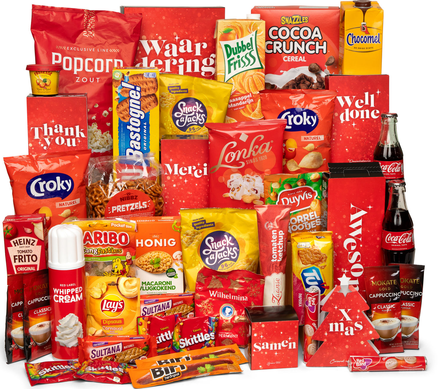 Op deze foto zie je een feestelijk samengestelde geschenkdoos vol met diverse lekkernijen en drankjes. De producten zijn verpakt in aantrekkelijke, kleurrijke verpakkingen met een kerstthema. De variëteit aan snacks en dranken biedt een uitgebreide keuze voor verschillende smaken en voorkeuren, van hartige snacks tot zoete traktaties. Deze geschenkdoos is perfect voor feestelijke gelegenheden, het verwennen van vrienden en familie, of als een speciale traktatie voor jezelf tijdens de feestdagen.De overvloed en diversiteit zorgen ervoor dat er voor ieder wat wils is, waardoor het een ideaal cadeau is voor iedereen die houdt van een smakelijke verrassing.