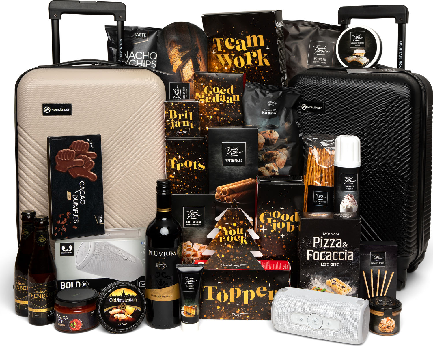 Deze samengestelde geschenkset is perfect voor het creëeren van bijzondere momenten. Verpakt in stijlvolle koffers, biedt het een verfijnde selectie van lekkernijen om van te genieten. De set bevat een scala aan producten variërend van smaakvolle snacks tot verfrissende dranken. Het moderne design van de koffers maakt ze ideaal voor zowel reislustigen als thuissfeermakers. Perfect als welverdiende traktatie of uniek cadeau-idee. Voeg een tintje luxe toe aan je dagelijkse ervaring met deze uitgebreide collectie.