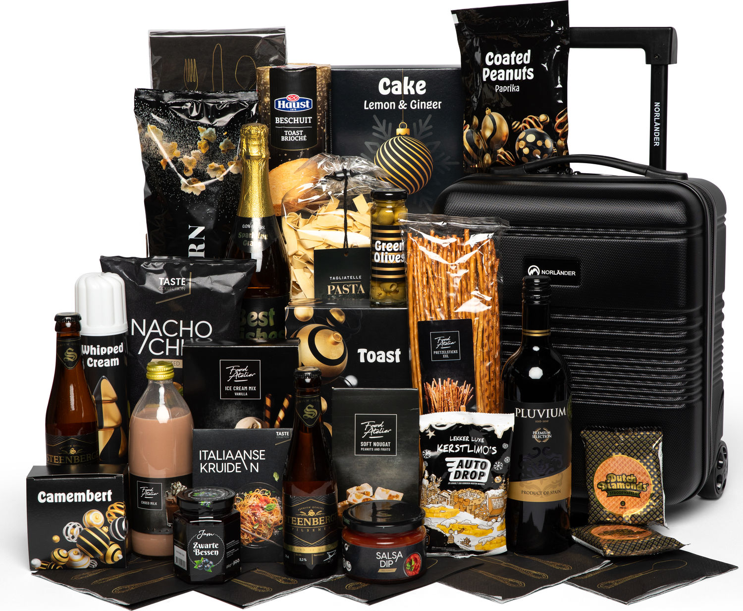 Met dit kerstpakket vol overheerlijke producten ga je de feestdagen goed in. We hebben het pakket gevuld met allerlei smakelijke artikelen om op ieder moment van de dag van te genieten. De luxe compacte trolley is speciaal gemaakt om onder de stoel in het vliegtuig te passen. Hierdoor mag deze trolley mee als handbagage bij alle luchtvaartmaatschappijen. De trolley heeft een uitschuifbare stang en twee luxe soft wieltjes. De binnenzijde bestaat uit een hoofdcompartiment met buckles en een ritsvak.