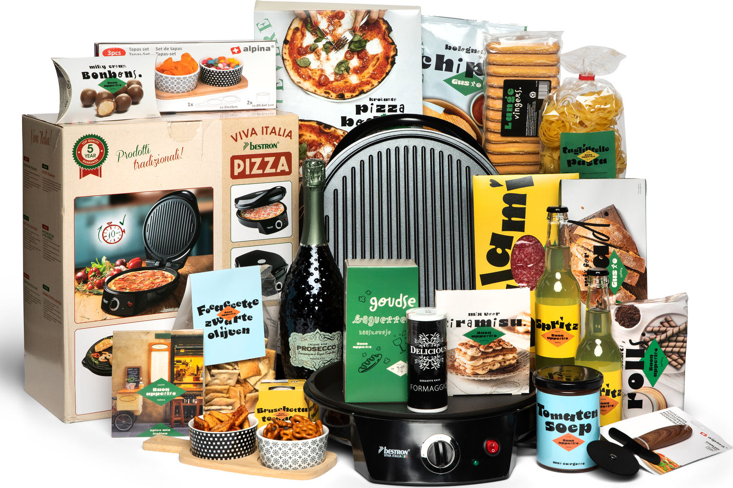 Proef de smaak van Italie. Haal de authentieke Italiaanse keuken in huis met dit smaakvolle kerstpakket. De Bestron pizzamaker / tafelgrill is perfect voor pizza’s met een diameter van 27 cm en is in ongeveer 10 minuten klaar voor gebruik. De platenhebben een anti-aanbaklaag. In geopende toestand verandert de pizzaoven in een grote tafelgrill. Het apparaat is voorzien van 2 verwarmingselementen voor een gelijkmatige verwarming. Verder heeft hij een draaiknop om de temperatuur in te stellen eneen aan/uit-schakelaar met indicatielampje. Natuurlijk mag in dit Italiaanse pakket geen pizzasnijder ontbreken. En in de trendy serveerset serveer je allerlei lekkere snacks. Dit pakket maakt van elk moment een Italiaanse ervaring.