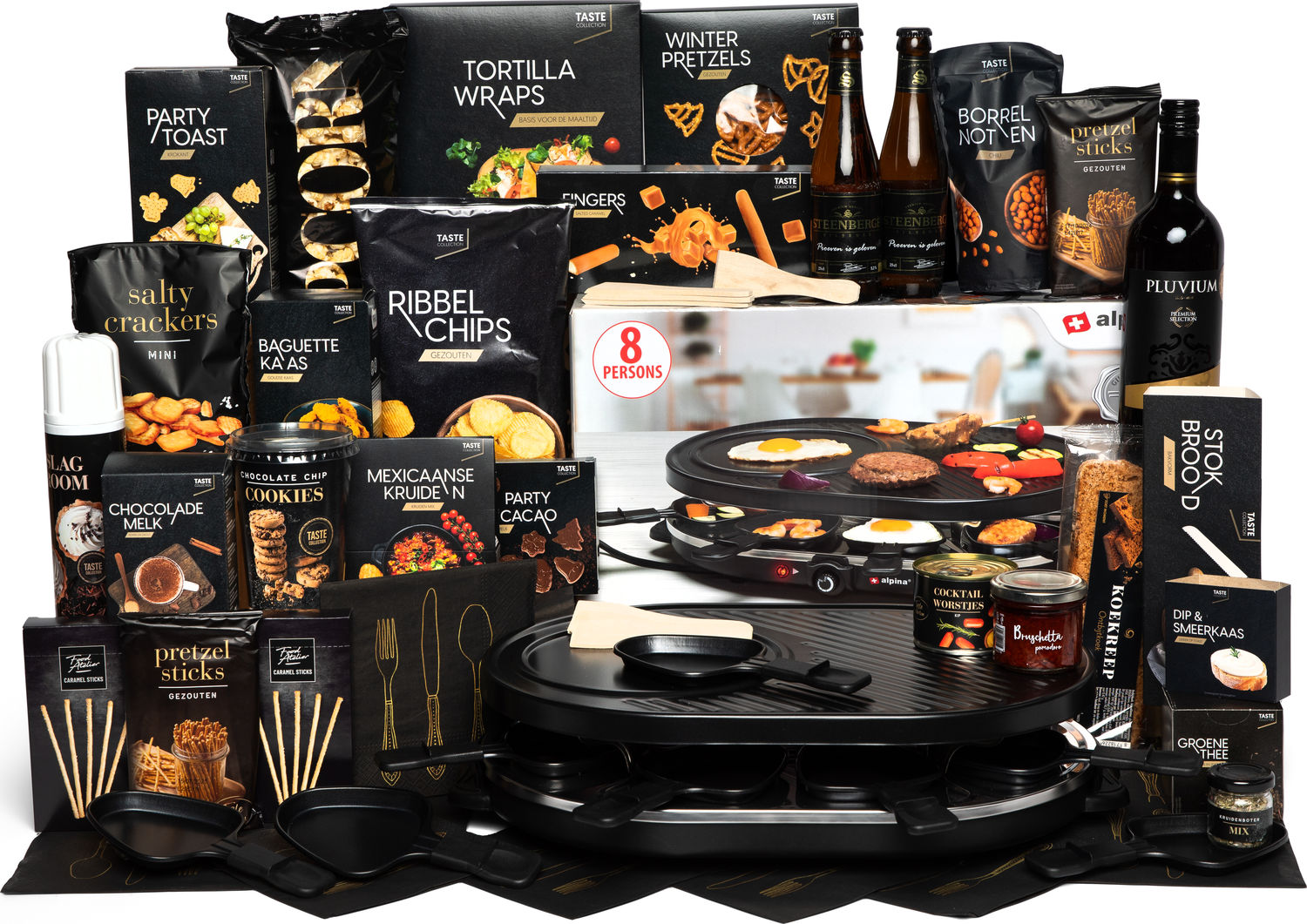 Samen gourmetten, racletten of bakplaten; met dit Alpina gourmetstel geniet je daarvan met een groep tot wel 8 personen. Gezellig om met vrienden, familie of je gezin te doen, bijvoorbeeld tijdens feestdagen. De set bestaat uit 2 lagen. Bovenop heb je een bakplaat, deels glad en deels geribbeld. Onderop is plaats voor de pannetjes. Bij de set zijn 8 gourmetpannen en 8 spatels inbegrepen. Zo hoef je alleen nog maar de boodschappen te doen om te beginnen. Van dit bomvolle luxe kerstpakket zal de ontvanger nog lang genieten.