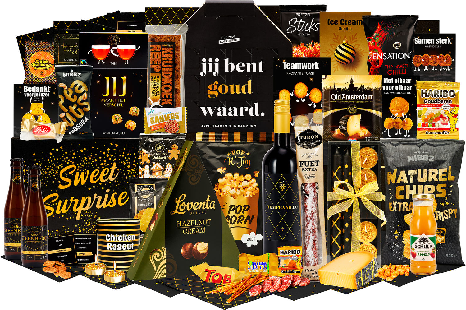 - Geschenkdoos met strik, 21 x 8,5 x 4 cm, Dinerkaarsen, 20 cm, 2 st, waxines, 4 st, Kaartspel "Weet jij het?", Servetten, 8 st, Rode wijn, Tempranillo, 0,75ltr, Bier, Steenberge, 0,25 ltr, 2 st, Schulp appelsap, 0,2 ltr, Zwarte thee, 5 st, Fuet worst,150 gr, Pasteitjes kerstklok, 100 gr, Hartige zoutjes peper-zeezout, 60 gr, Kaaswafelbolletjes, 50 gr, Krokante toast, 75 gr, Pretzels, 40 gr, Koekreep, 110 gr, Popcorn, 70 gr, Pinda's gezouten, 50 gr, Ribbelchips gezouten, 90 gr, Chocolade hazelnoot pralines, 110 gr, Stroopwafel, 64 gr, 2 st, Haribo goudbeertjes, 75 gr, Appeltaartmix in bakvorm, 300 gr, Ijsmix vanille, 125 gr, Ragout kip, 290 gr, Lay's sensations thai sweet chilli, 40 gr, Old amsterdam wigstuk, 150 gr, Kerstkoekjes, 80 gr, Sweet box inhoud:, Geschenkdoos Sweetbox, 16 x 23 x 2,5 cm, De la Digue boterwafels, 10 gr, 3st, Kanjers mini stroopwafels, 8 gr, De ruiter speculoos koekjes, 25 gr, Haribo goudbeertjes zakje, 10 gr, Lonka nougat caramel, 12 gr, Tiny tony chocolonely puur, mini, Toblerone, mini*, Verpakt in feestelijke kerstdoos 39 x 29 x 23,2 cm