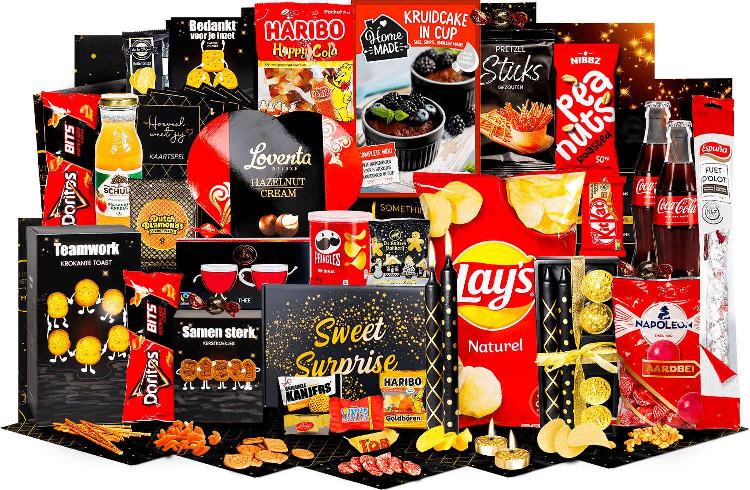 - Geschenkdoos met strik, 21 x 8,5 x 4 cm, Dinerkaarsen, 20 cm, 2 st, waxines, 4 st, Kaartspel "Weet jij het?", Schulp appelsap, 0,2 ltr, Coca cola regular, fles, 0,2 ltr, 2 st, Zwarte thee, 5 st, Fuet worst, 150 gr, Hartige zoutjes peper-zeezout, 60 gr, Krokante toast, 75 gr, Pretzels, 40 gr, kruidcake in a cup, 280 gr, Chocolade hazelnoot pralines, 110 gr, Pinda's gezouten, 50 gr, Stroopwafel, 64 gr, 2 st, Napoleon aardbeikogels, 80 gr, Kitkat, 41,5 gr, Haribo happy cola, 75 gr, Pringles original, 40 gr, Lay's chips naturel, 100 gr, Doritos bits twisties honey bbq, 30 gr, 2 st, Kerstkoekjes, 80 gr, Sweet box inhoud:, Geschenkdoos Sweetbox, 16 x 23 x 2,5 cm, De la Digue boterwafels, 10 gr, 3st, Kanjers mini stroopwafels, 8 gr, De ruiter speculoos koekjes, 25 gr, Haribo goudbeertjes zakje, 10 gr, Lonka nougat caramel, 12 gr, Tiny tony chocolonely puur, mini, Toblerone, mini*, Verpakt in feestelijke kerstdoos 39 x 29 x 17,5 cm