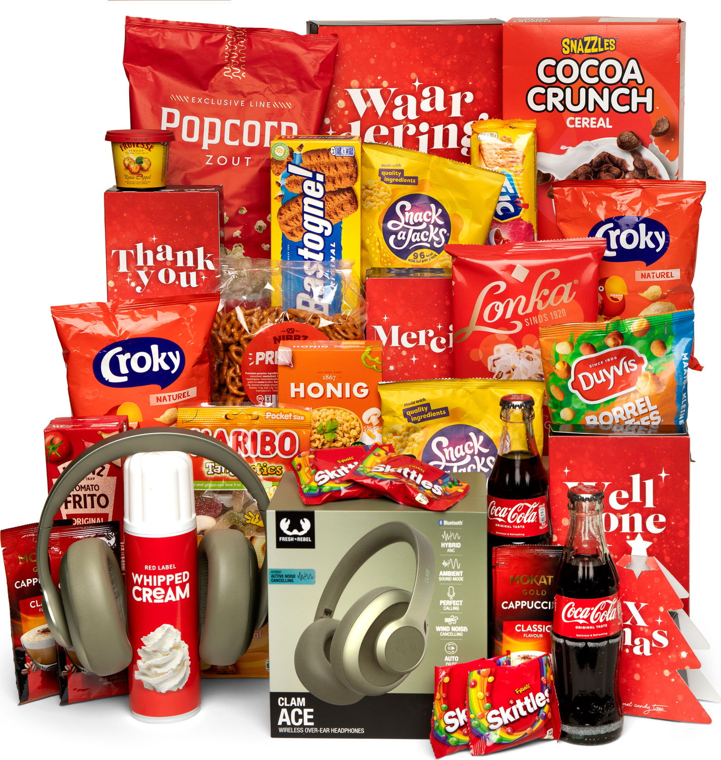 Ontdek een veelzijdig en feestelijk cadeaupakket vol met lekkernijen en accessoires die perfect zijn voor elke gelegenheid. Dit uitgebreide pakket biedt een aantrekkelijke mix van zoete en zoute snacks, ideaal voor het delen met vrienden en familie.Verwen jezelf met knapperige chips, smakelijke snoepjes en verfrissende dranken. Daarnaast zorgen de luxe accessoires voor een extra speciale ervaring, waardoor dit geschenk ideaal is voor zowel jong als oud. Het kleurrijke en aantrekkelijke ontwerpvan het pakket zorgt ervoor dat het niet alleen heerlijk, maar ook visueel aantrekkelijk is. Ideaal als cadeau voor feestdagen, verjaardagen of als bedankje.