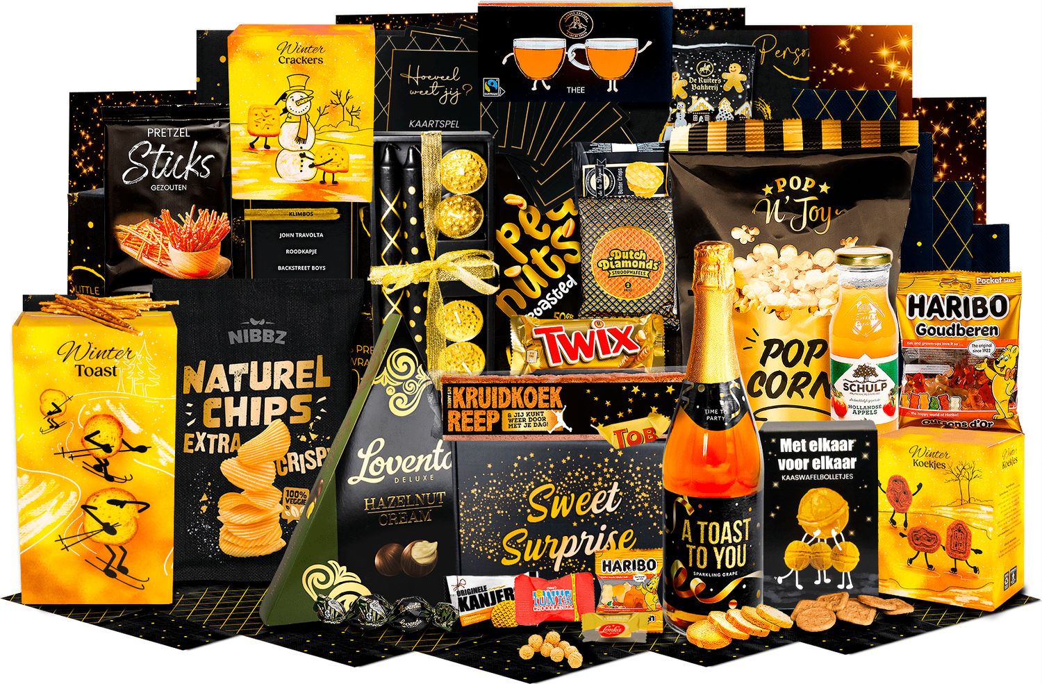 - Geschenkdoos met strik, 21 x 8,5 x 4 cm, Dinerkaarsen, 20 cm, 2 st, waxines, 4 st, Kaartspel "Weet jij het?", Servetten, 8 st, Sparkling grape, 750 ml, Schulp appelsap, 0,2 ltr, Zwarte thee, 5 st, Hartige zoutjes peper-zeezout, 60 gr, Kaaswafelbolletjes, 50 gr, Krokante toast, 75 gr, Pretzels, 40 gr, Koekreep, 110 gr, Popcorn, 70 gr, Pinda's gezouten, 50 gr, Ribbelchips gezouten, 90 gr, Chocolade hazelnoot pralines, 110 gr, Stroopwafel, 64 gr, 2 st, Haribo goudbeertjes, 75 gr, Twix, 50 gr, Kerstkoekjes, 80 gr, Sweet box inhoud:, Geschenkdoos Sweetbox, 16 x 23 x 2,5 cm, De la Digue boterwafels, 10 gr, 3st, Kanjers mini stroopwafels, 8 gr, De ruiter speculoos koekjes, 25 gr, Haribo goudbeertjes zakje, 10 gr, Lonka nougat caramel, 12 gr, Tinytony chocolonely puur, mini, Toblerone, mini*, Verpakt in feestelijke kerstdoos 39 x 29 x 17,5 cm