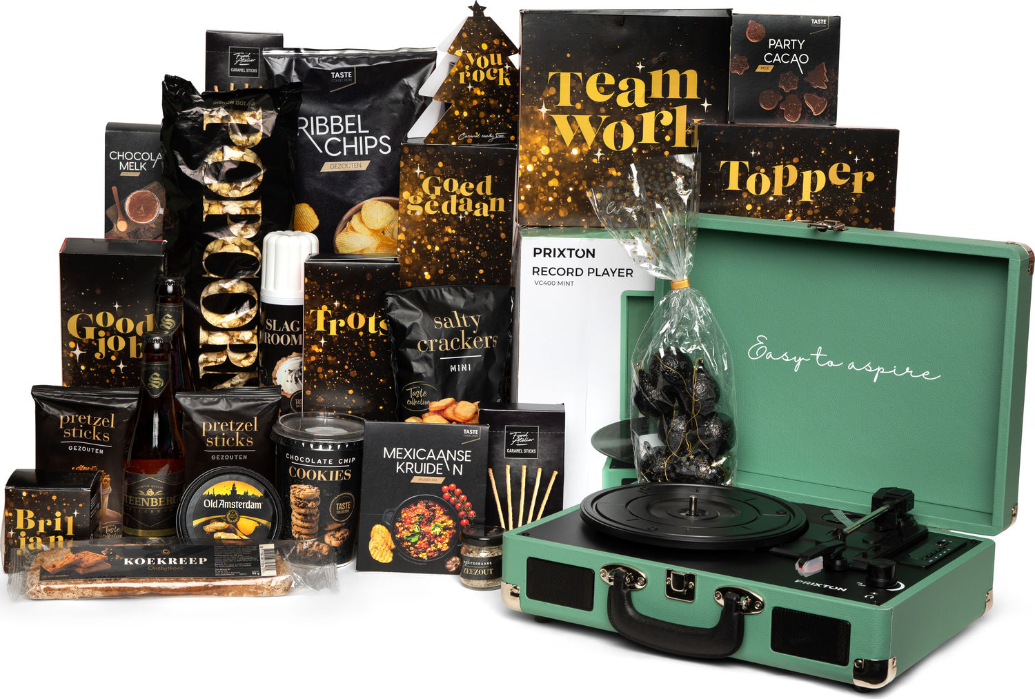 Ervaar een ultieme muzikale en culinaire belevenis met deze exclusieve giftset. In het hart van deze set bevindt zich een stijlvolle, vintage platenspeler die elke luisterervaring naar een hoger niveau tilt. Omringd door een zorgvuldig samengesteldeselectie van heerlijke lekkernijen, biedt deze set een perfecte combinatie van geluid en smaak. Geniet van de rijke aroma’s en smaken terwijl u uw favoriete muziek afspeelt. Deze set is ideaal voor elke muziekliefhebber die graag geniet van luxe en verrassende traktaties. Perfect als cadeau of om uzelf te verwennen met iets speciaals.