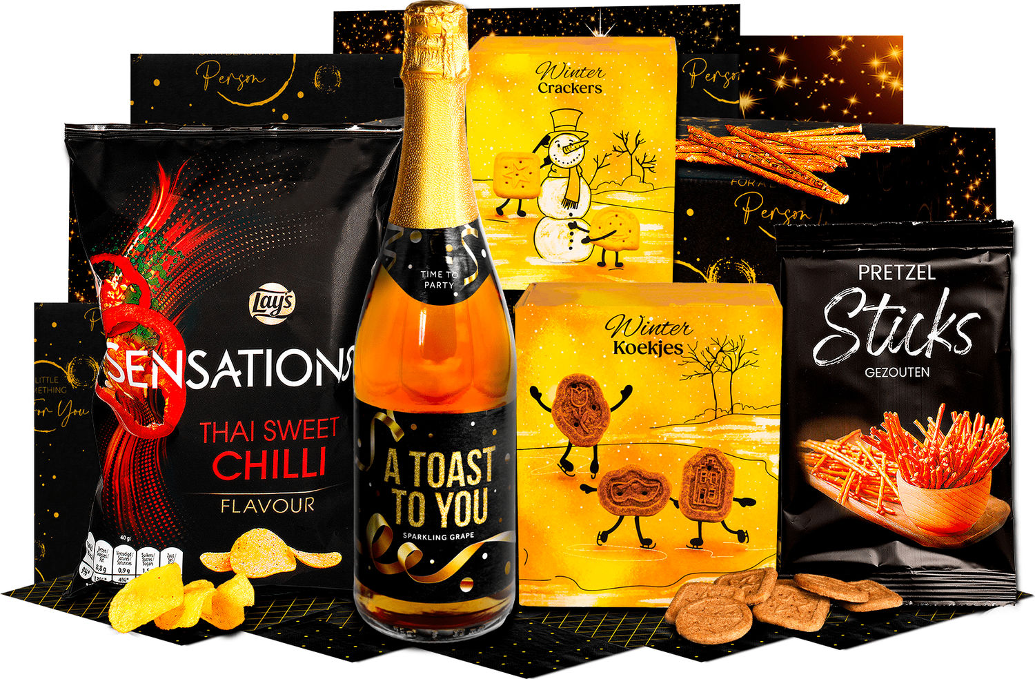 - Sparkling grape, 750 ml, Hartige zoutjes peper-zeezout, 60 gr, Pretzels, 40 gr, Lay's sensations thai sweet chilli, 40 gr, Kerstkoekjes, 80 gr, Verpakt in feestelijke kerstdoos 31 x 20 x 14 cm