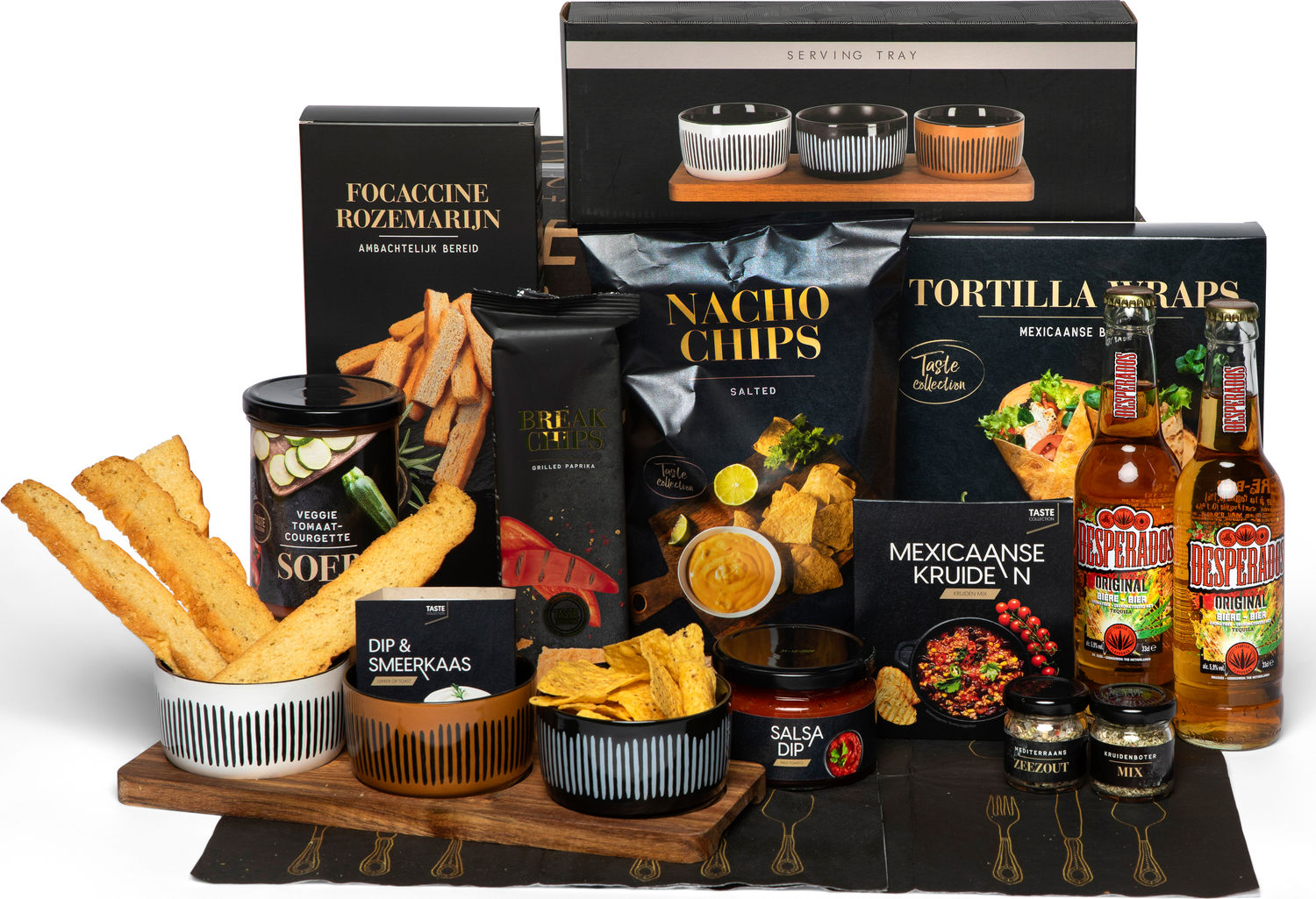 Dit serveerplankje met drie schaaltjes is perfect voor bij het borrelen. Serveer je favoriete dipsausjes, zelfgemaakte kruidenboter of andere lekkere snacks in de bakjes. De serveerplank is gemaakt van acaciahout en de schaaltjes van keramiek. Door de inkepingen in de serveerplank schuiven de bakjes niet van de plank af. De bakjes hebben verschillende kleuren, wat deze serveerplank erg origineel maakt. De schaaltjes zijn vaatwasser, oven en magnetron bestendig. Dat wordt smikkelen en smullen metdit smaakvolle Mexicaanse kerstpakket.